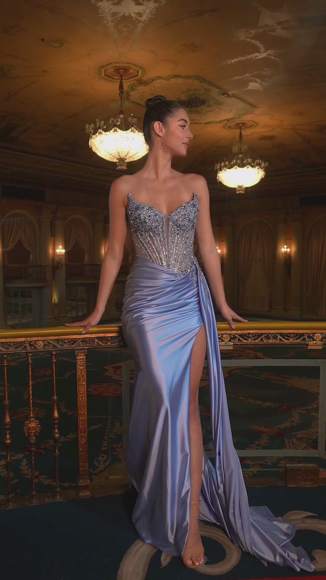 Crafted for the spotlight, this fitted evening gown radiates luxury with its sweetheart neckline and sheer corset bodice covered in glistening beadwork. The satin draped skirt smooths over the figure and falls into a bold high leg slit that adds striking movement and drama. A flowing side sash enhances the silhouette with a touch of elegant flair, while the lace up back allows for a sculpted and comfortable fit. Perfect for prom, red carpet moments, or any formal occasion where unforgettable glamour is the goal.