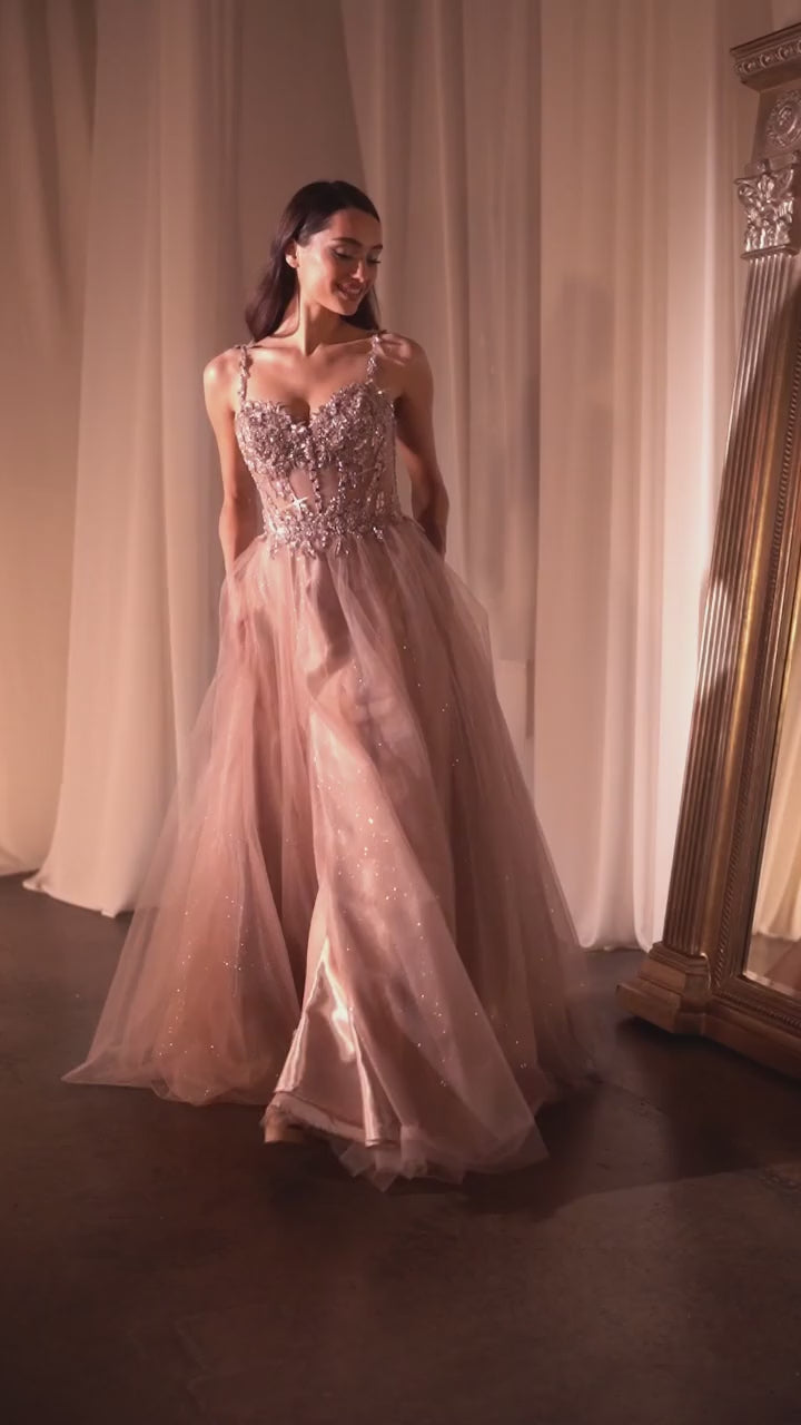 Unleash your inner princess in this enchanting A-line dress, a dreamy creation destined to make you the belle of the ball. The embellished lace bodice is a masterpiece of intricate details, while the sheer waistline structure adds a touch of modern flair to this timeless silhouette. Delicate lace appliqué straps delicately grace your shoulders, enhancing the romantic charm. The layered glitter tulle skirt sparkles with every twirl, creating a magical aura that's perfect for the young and vibrant. A playful leg slit adds a hint of flirtation, allowing you to dance the night away with confidence. The lace-up corset back closure not only ensures a perfect fit but adds a touch of whimsy to this fairytale ensemble.