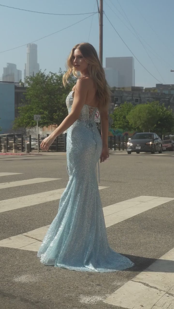 This fitted gown dazzles with its strapless sweetheart neckline and sheer, fully beaded bodice that radiates glamour. The structured bodice with a lace-up corset back ensures a secure and flattering fit, while the leg slit adds a touch of allure. Perfect for prom, black-tie affairs, or formal events, this dress combines elegance and sparkle effortlessly.