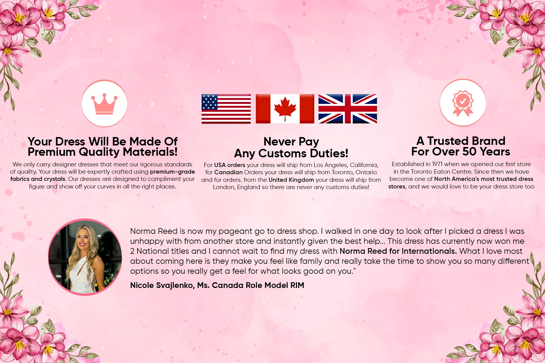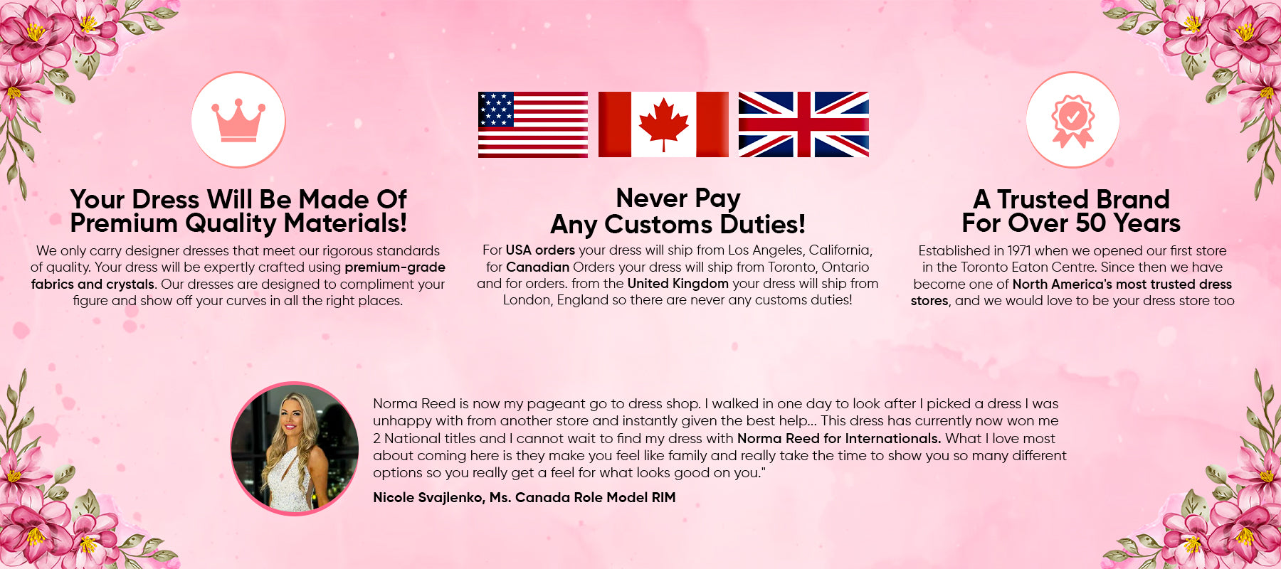 "I have always been one for glam and Norma Reed certainly does not disappoint. Their selection is fantastic with something for every occasion. Their customer service is always on-point...