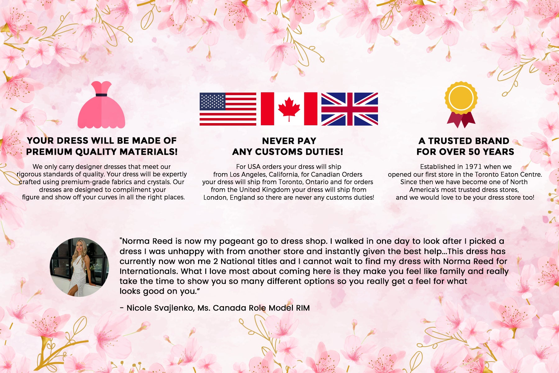 "Norma Reed is now my pageant go to dress shop. I walked in one day to look after I picked a dress I was unhappy with from another store and instantly given the best help. Diana is so wonderful and picked a dress for me I wouldn’t have even thought of and I instantly fell in love with it. This dress has currently now won me 2 National titles and I cannot wait to find my dress with Norma Reed for Internationals. What I love most about coming here is they make you feel like family and really take the time to show you so many different options so you really get a feel for what looks good on you. I love Norma Reed and can’t say enough nice things. If you’re looking for a dress store that will find you exactly what your heart wants, look no further. :)"