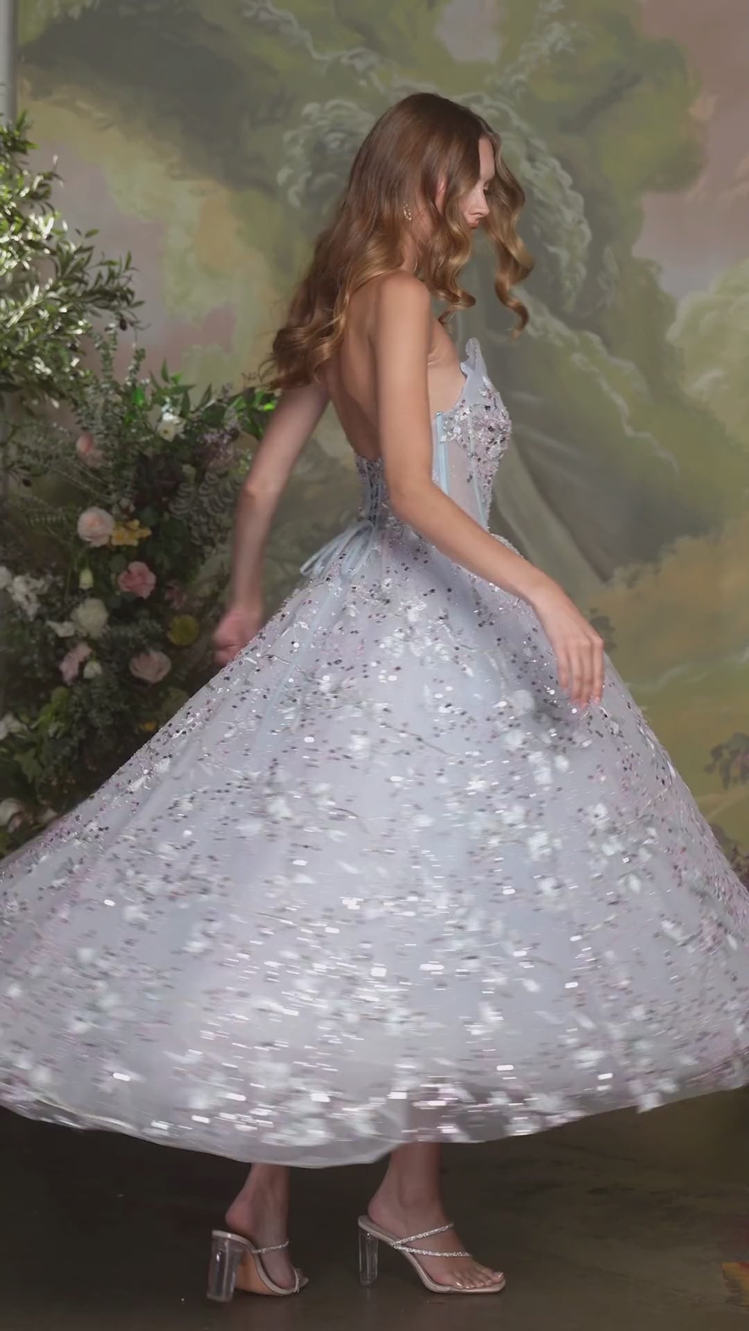 The mid length skirt floats gracefully as you walk, giving the gown a light and whimsical charm that feels straight out of a storybook. Perfect for garden parties, formal soirées, or any celebration filled with enchantment and elegance.