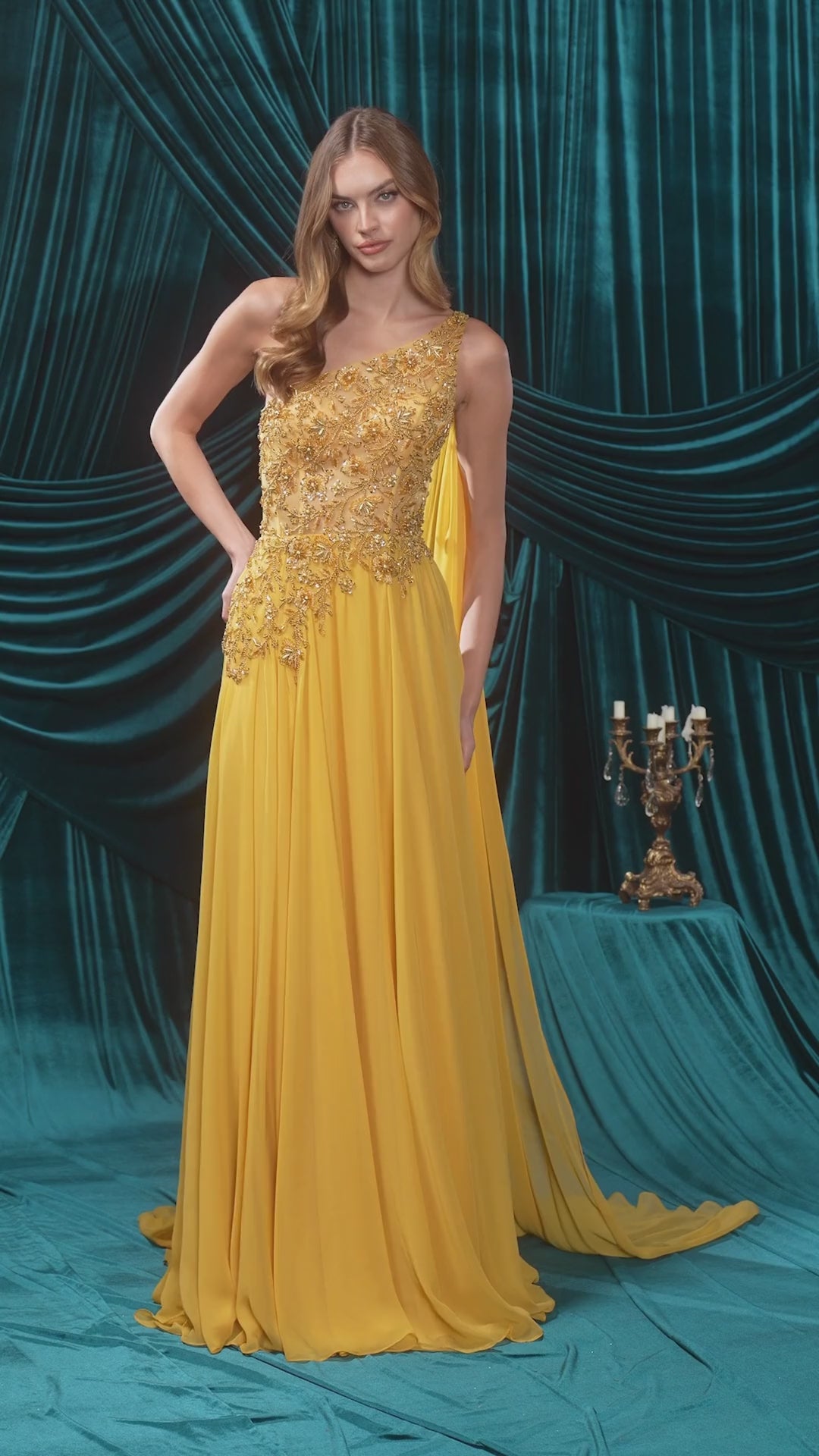 Step into true regal beauty with this breathtaking marigold gown that blends timeless glamour with soft, modern elegance. The one shoulder neckline is adorned with intricate beaded floral embellishments that bring radiant sparkle to the entire look. The sheer bodice flows into a graceful chiffon skirt that moves effortlessly with every step, creating a light and ethereal presence.